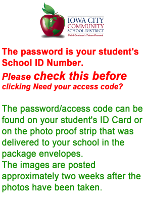 The password/access code can be found on your student's ID Card or on the photo proof strip that was delivered to your school in the package envelopes. The images are posted approximately two weeks after the photos have been taken.